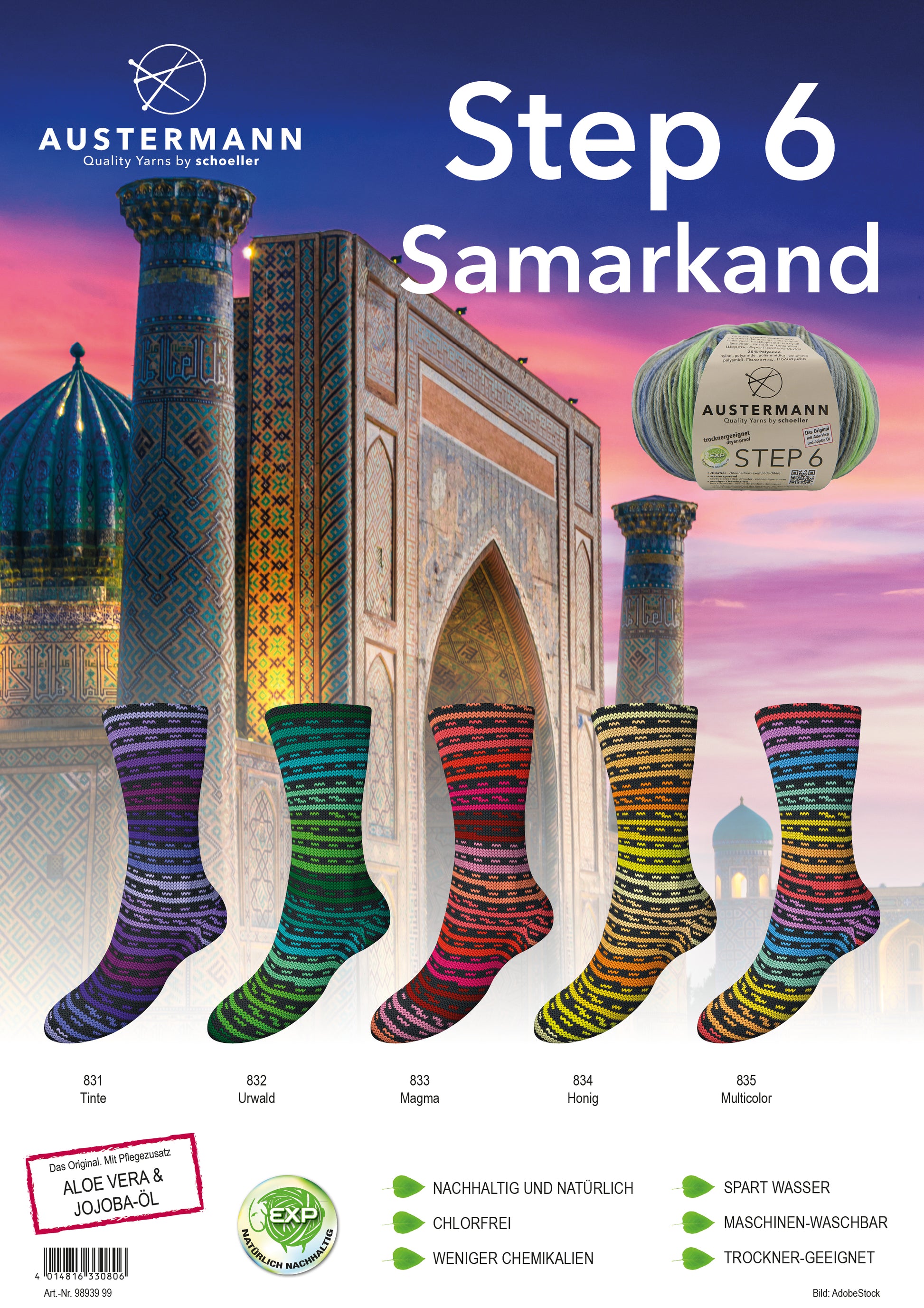 Suositun Step-sukkalangan paksummassa versiossa Step 6 -langassa yhdistyvät pehmeys, laadukkuus ja ekologisuus. Step-langassa on Aloe Vera- ja Jojoba -käsittely, mikä tekee siitä pehmeän ja ihoa hellivän sekä miellyttävän neuloa. Aloe Vera- ja Jojoba-öljy säilyvät langassa jopa 40 pesukertaa. Stepistä neulot lämpimät ja mukavat villasukat. Erittäin riittoisa kerä.