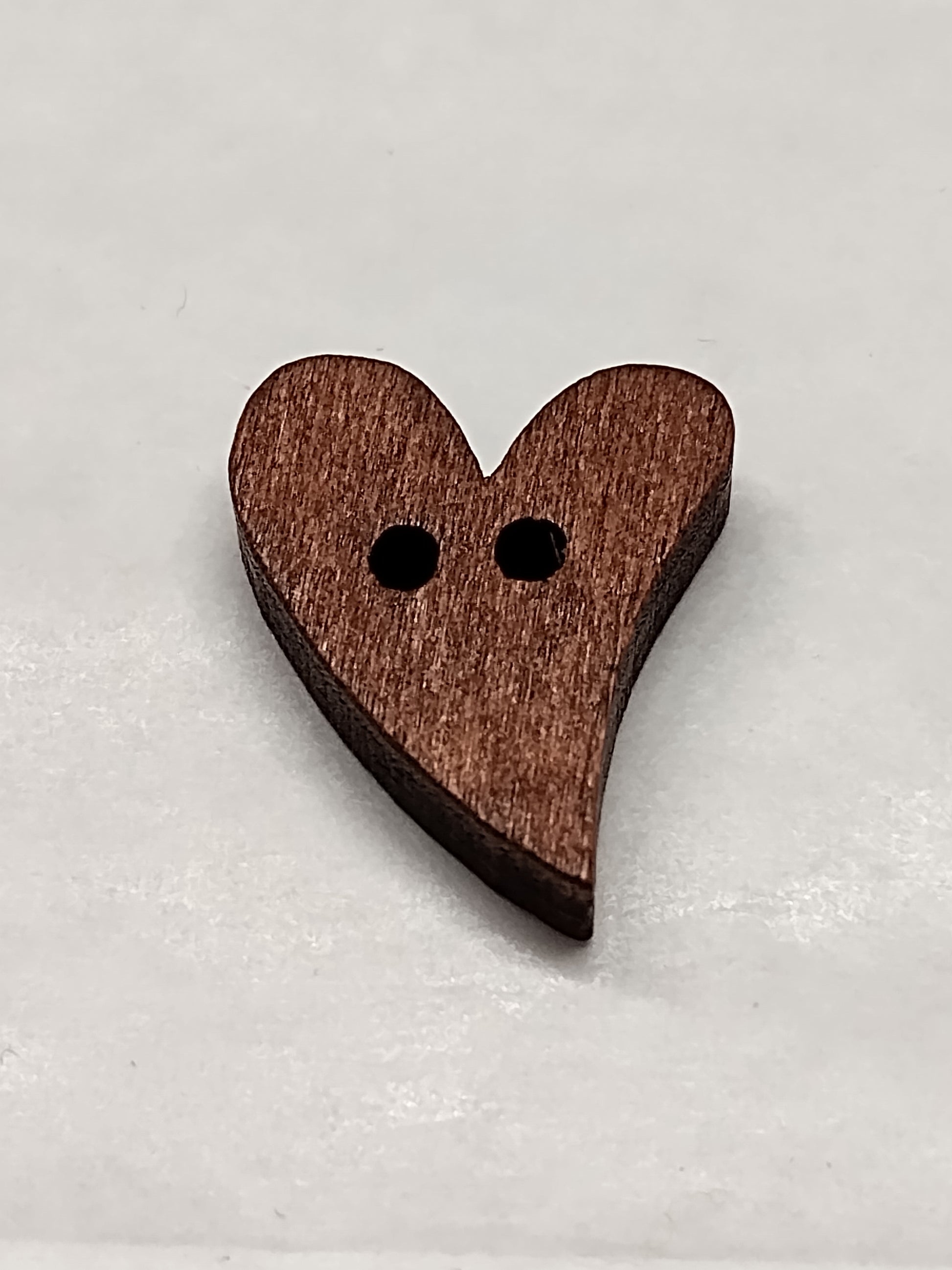 Ruskea sydännappi on korkeudeltaan 30 mm ja leveimmästä kohdasta 25 mm. Napin paksuus on 4 mm.